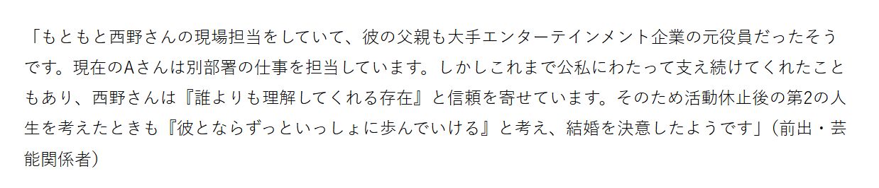 馴れ初めが社内恋愛だったという話については、2016年以降、週刊誌によってたびたび報じられてきました。西野カナさんと松尾共祥さんが都内で一緒にジョギングをしていたり、ショッピングを楽しんでいる姿が目撃され、そのたびにネット上で話題になっていました。ふたりは、周囲にバレないようにごく自然体で過ごしていたそうですが、親しい関係者の間では「やっぱり、いい感じなんじゃない?」という噂があったとのことです。